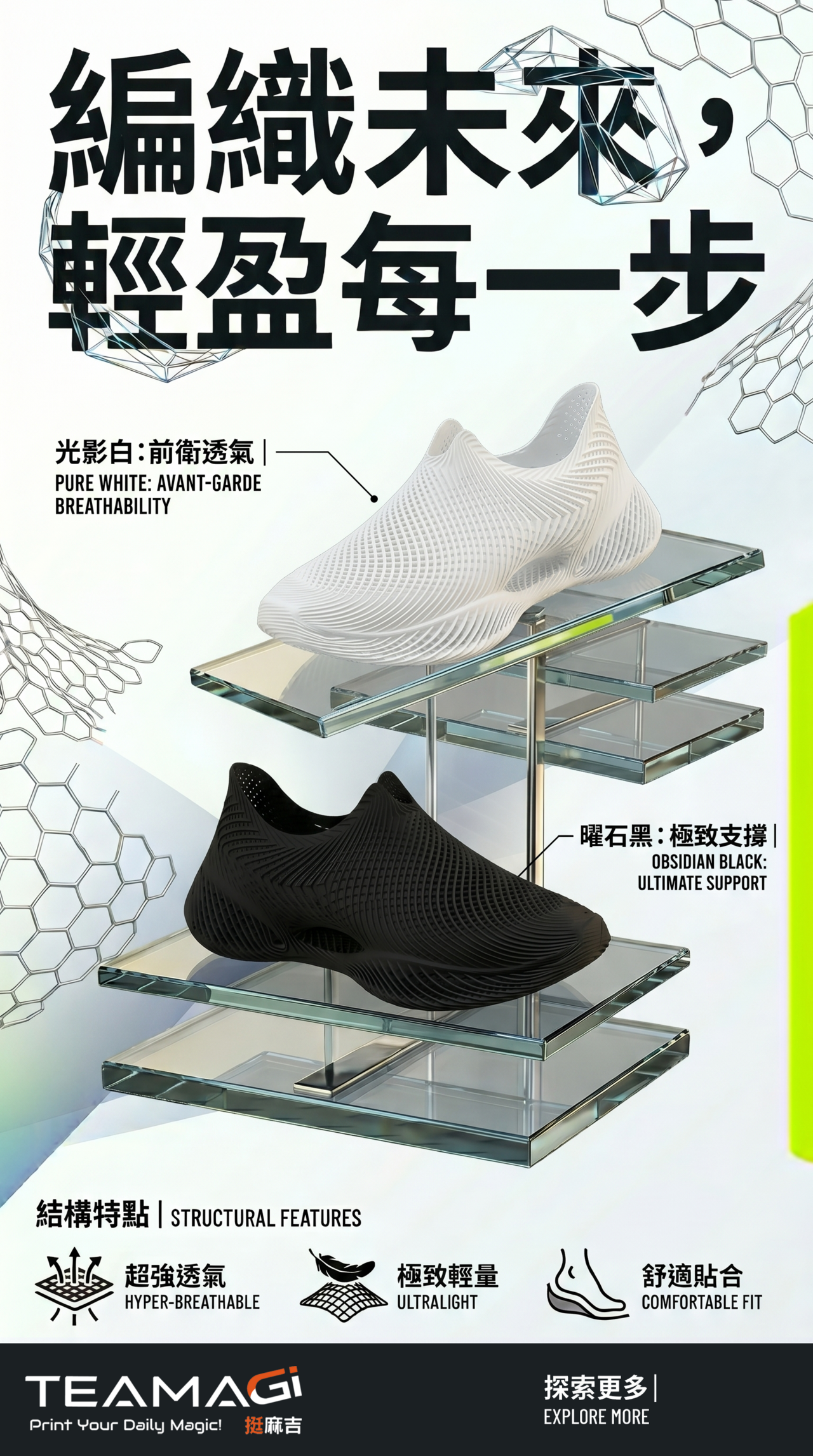 打破傳統製鞋框架,我們利用先進的 3D 列印技術,打造出如建築般精密的「中空晶格結構」。這不僅是一雙鞋,更是穿戴在腳上的數位藝術。超輕量化設計與極致透氣性能,讓您在城市探索或室內放鬆時,都能體驗到前所未有的科技包覆感。